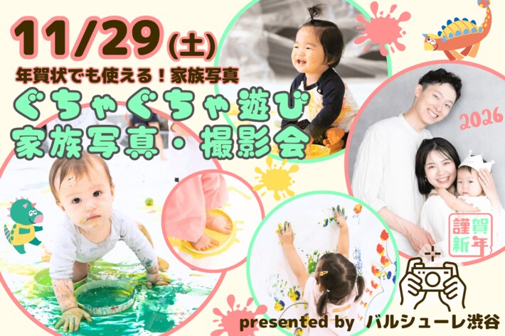 人気のぐちゃぐちゃ遊び。この度の開催では、年賀状にもご利用いただける『家族写真撮影会』とのコラボレーションを行います。「遊びは学び」のバルシューレ渋谷が、スポーツだけではなく創造力を育むアート活動を提供します!