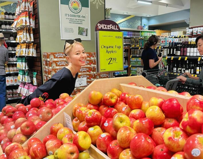 別の写真では、スーパーマーケットでたくさんのりんごと一緒に写る山本さんが舌をぺろっと出したショットや…