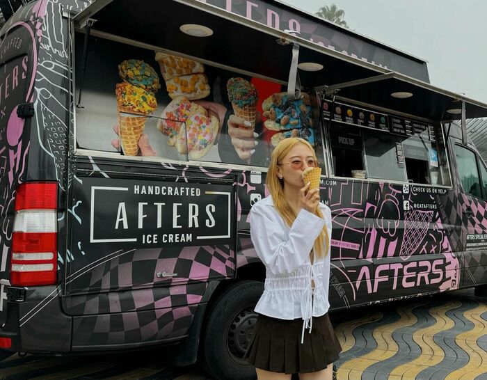 ウエストが絞られた白のブラウスに黒のミニスカートを合わせたコーディネートで、アイスクリームを食べてうれしそうな表情を見せる様子も!