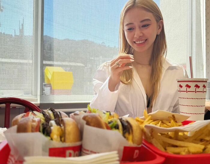 写真を見ると、山本さんのヘアが金髪に大胆イメチェン!ハンバーガーを見つめながら笑顔を見せています。