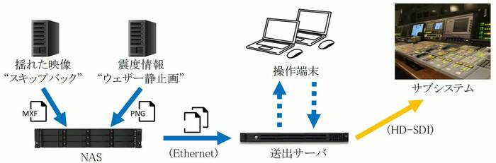 本システムは、一定時間遡って地震で揺れた瞬間を録画したスキップバック映像と震度情報のファイルを、それぞれの外部システムから自動的に取得し、HD-SDI信号で送出するもの。