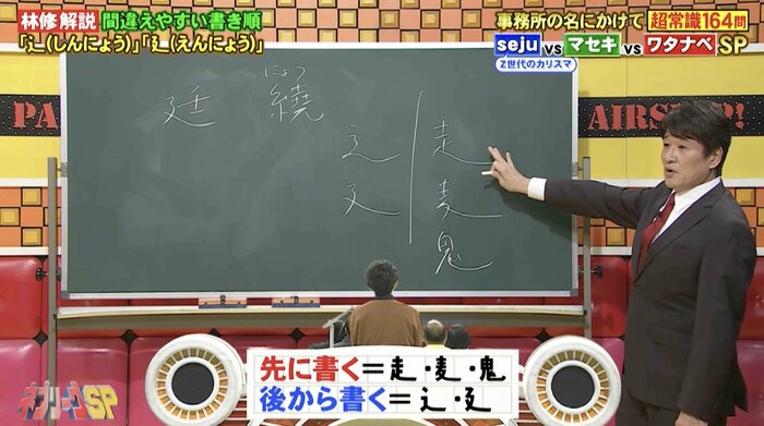 また林先生は、「大和朝廷」の「廷」の字の書き順についても紹介。部首である「廴(えんにょう)」を先に書いてしまう人が多いそうなのですが、「廴」は後で書くのが正しいのだそう。