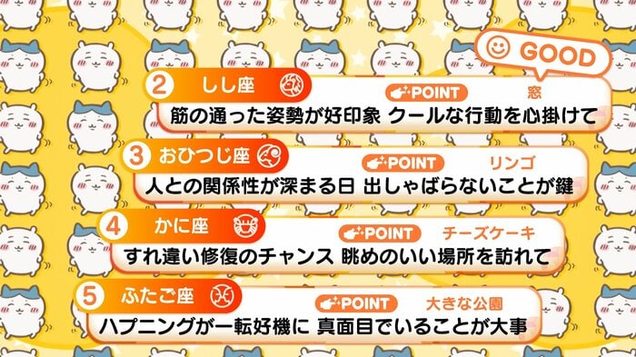 『めざましテレビ』で放送中の「ちいかわ占い」 テレビ放送がない日はお休みで、月~土:朝7時以降に更新予定です。