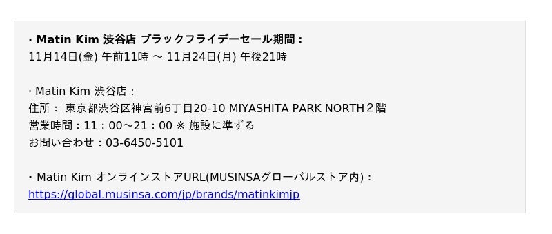 MUSINSAが日本国内での流通を担当する韓国発ファッションブランド「Matin Kim(マーティンキム)」が、11月14日(金)から11月24日(月)まで渋谷店にてブラックフライデーセールを開催します。