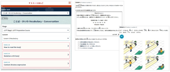 「すらら にほんご」JLPT対策コースの画面。左:「すらら にほんご」内から学習可能/右:実際の形式に合わせた豊富な問題