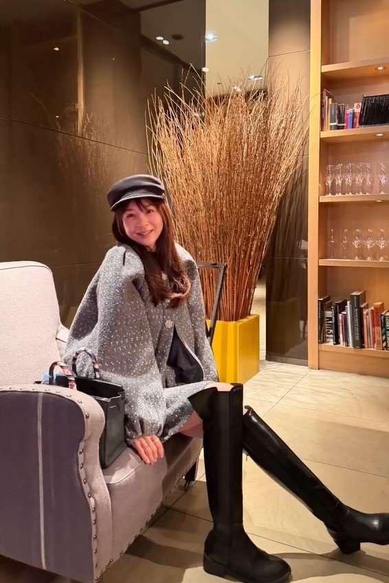 ほしのさんは、「今年はグレーな気分♡♡」とつづり、白いドット柄のツイードがデザインされたグレーのセットアップ姿のショットを公開。頭には黒のキャスケットをかぶり、足元には黒のニーハイブーツを合わせた秋らしいスタイルをして、ソファに座って笑顔を浮かべています。