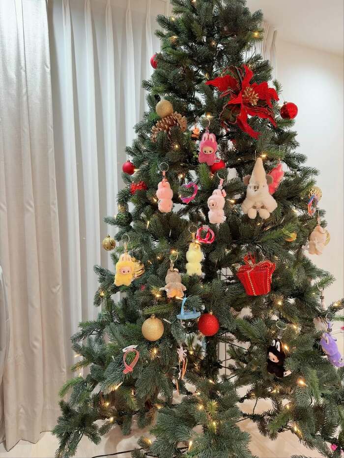 部屋に飾られた大きなツリーにはリルリンリンのぬいぐるみや大量のラブブが装飾として取り付けられています。