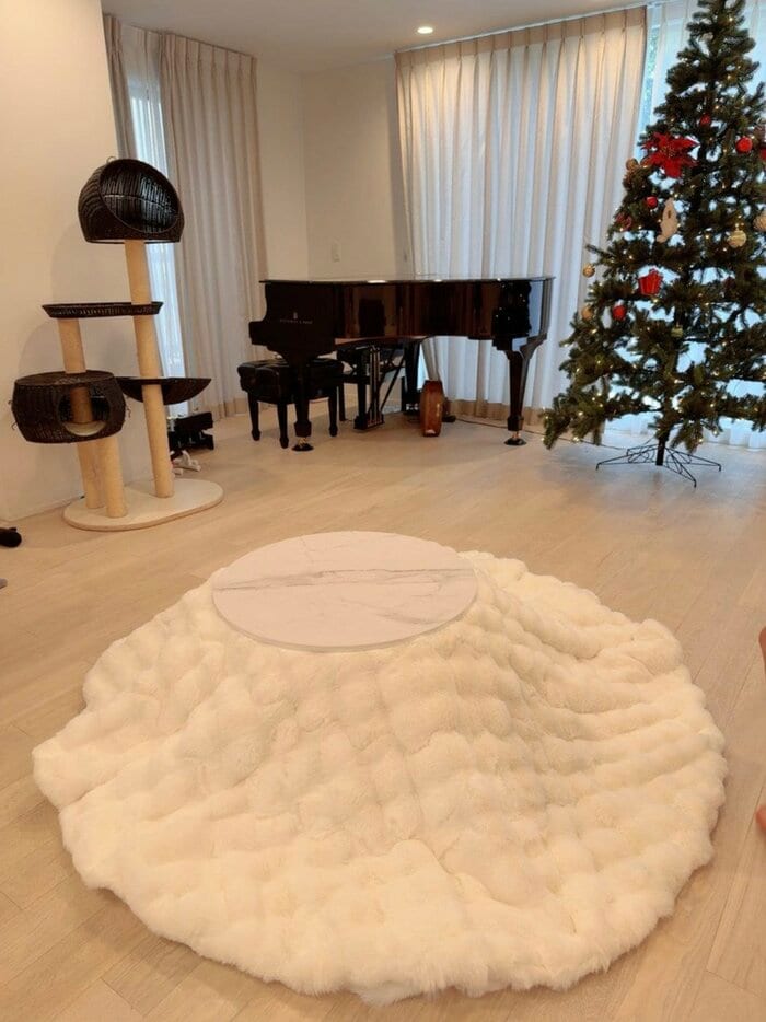 「フローリングのリビングに馴染むように円形のこれにしたよ プチプラだし、いいかんじ ほんわかしたあったかさが気持ちいいね」と、初めてのこたつにお気に入りの様子。