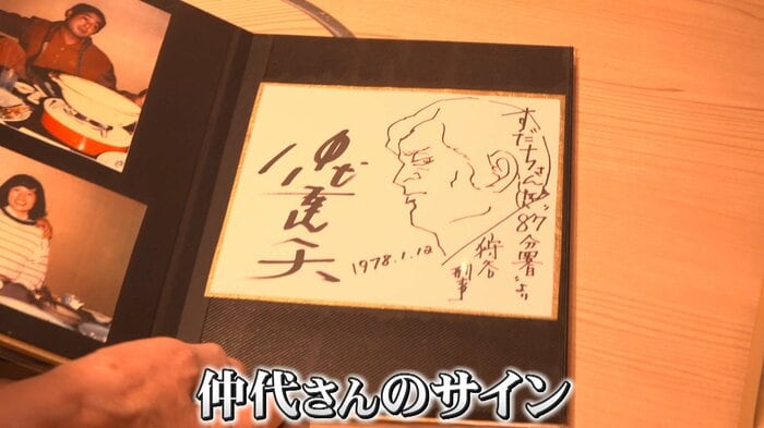 店を始めた50年前から現在に至るまで、撮りためた仲代さんの写真。その中には、1975年に妻の恭子さんと共に来店した時の写真も。