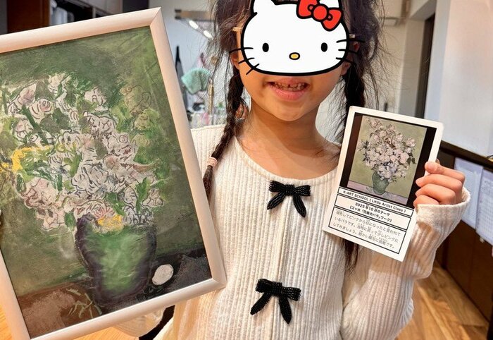 笑顔で自身が描いた作品を持っていて、どうやらフィンセント・ファン・ゴッホの『花瓶のバラ』の模写に挑戦したようです。