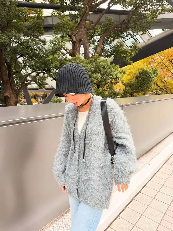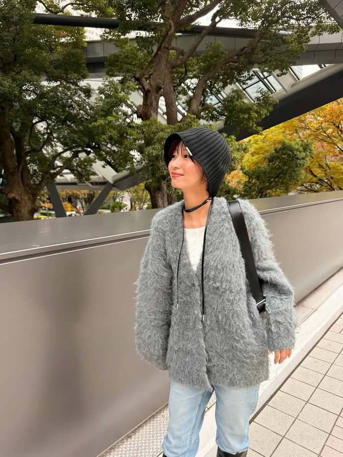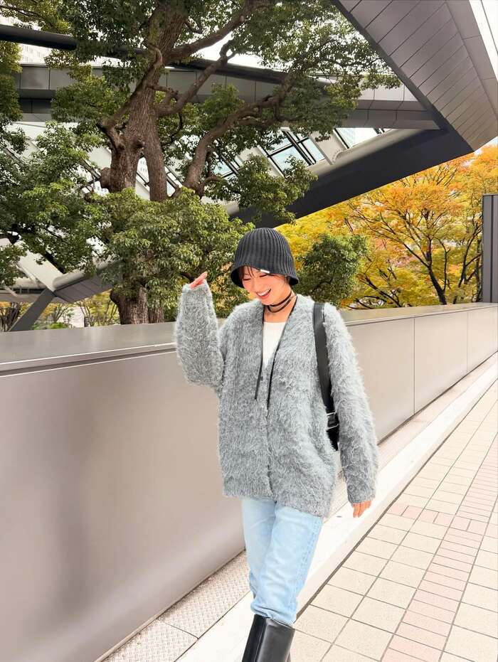 肩にショルダーバッグをかけ、グレーのロングシャギーカーディガンに身を包み、頭には黒のニット帽を被った岡崎さんは黄色に色づく木々をバックに冬コーデを披露。ふんわりゆったりとしたデザインのカーディガンで“萌え袖”になった手元がキュートな雰囲気を演出しています。