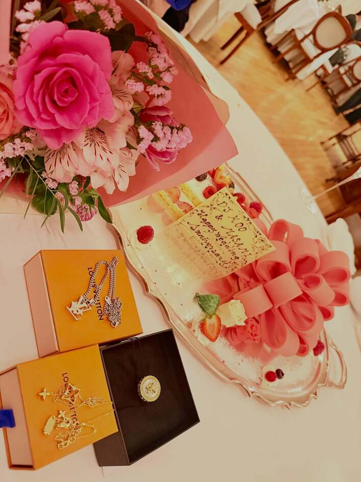 そして二人にお花まで!!」と、娘からお祝いでプレゼントをもらったことを明かし、「DJ KOO&MASAMI Happy Wedding Aniversary」と書かれたプレートが添えられた豪華なケーキや華やかなピンクの花束、きらびやかなルイ・ヴィトンのアクセサリーを並べたショットも公開しました。