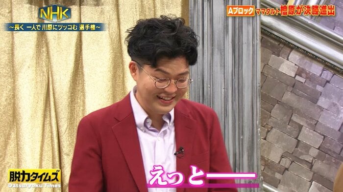 檜原さんが登場するも、川原さんは左半身が柱に引っかかって前に進めない様子。