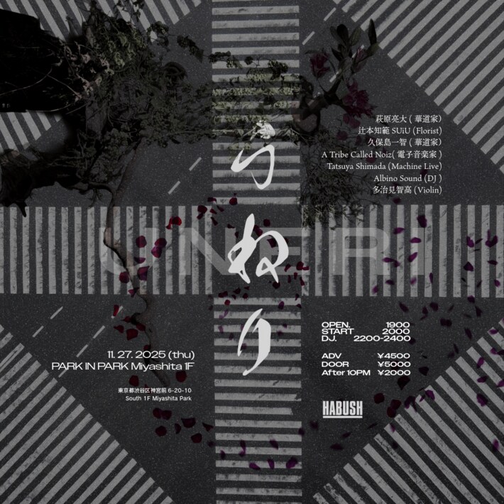 電子音楽家・DJによる音のうねり、ヴァイオリンの旋律、そして華道家たちの花の動きが呼応し、ひとつの“生きた作品”を生み出します。渋谷Miyashita Parkという文化創造の発信地で、日本の伝統美を新しい形で体験できる貴重な一夜です。