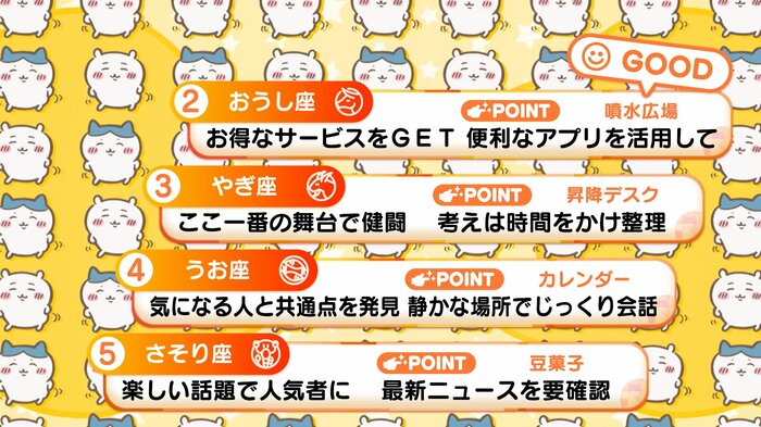 『めざましテレビ』で放送中の「ちいかわ占い」 テレビ放送がない日はお休みで、月~土:朝7時以降に更新予定です。