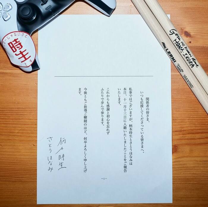写真1枚目には、台本のような紙に「関係者の皆さま、いつも応援してくださっている皆さまへ。」「私事ではございますが、柄本時生とさとうほなみは本日、十一月十三日に入籍いたしましたことをご報告いたします。」と縦書きでつづられています。