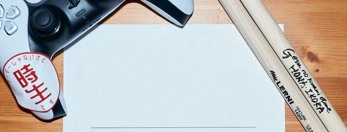 普段からゲーム実況をしている時生さんは、ゲームコントローラー。さとうさんは「HONA IKOKA」と書かれたドラムスティックを置いています。