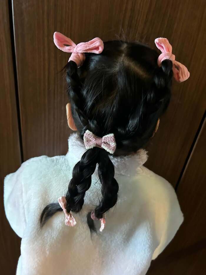 結び目はピンクのリボンがついたゴムでくくり、ガーリーなスタイルになっています。