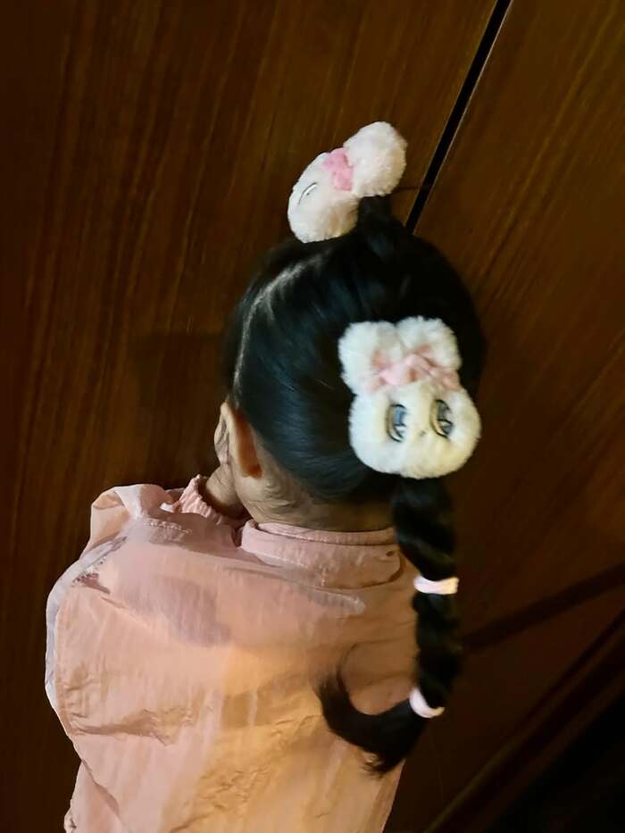 「エスターバニー」のヘアゴムと“バブ子”ちゃんが着ているトップスの色がピンクで統一されていて、キュートな雰囲気に仕上がっていますね。