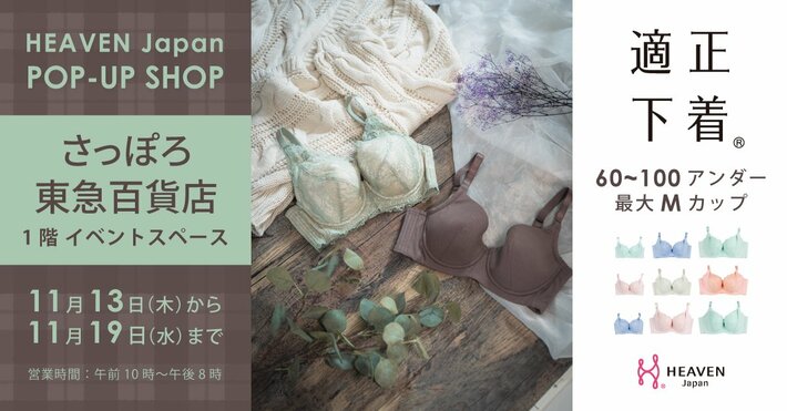 一人ひとりの女性の心と体に寄り添う「適正下着(R)」の開発から販売までを行う株式会社HEAVEN Japan(所在地:大阪府河内長野市、代表取締役:松田崇)は11月13日(木)~11月19日(水)の期間中、東急百貨店さっぽろ店にて、適正下着のフィッティング体験ができるポップアップショップを開催します。