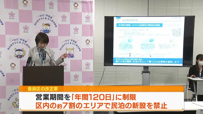 現在、法律で定められている、「全ての地域」で「年間180日営業可能」としている基準を、豊島区の改正案では営業期間を年間120日に制限。さらに、区内の約7割のエリアで、民泊施設の新設を禁止するとしています。