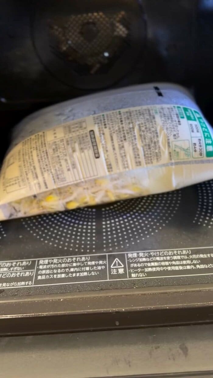 袋に入った豆もやしをそのまま電子レンジで加熱します。