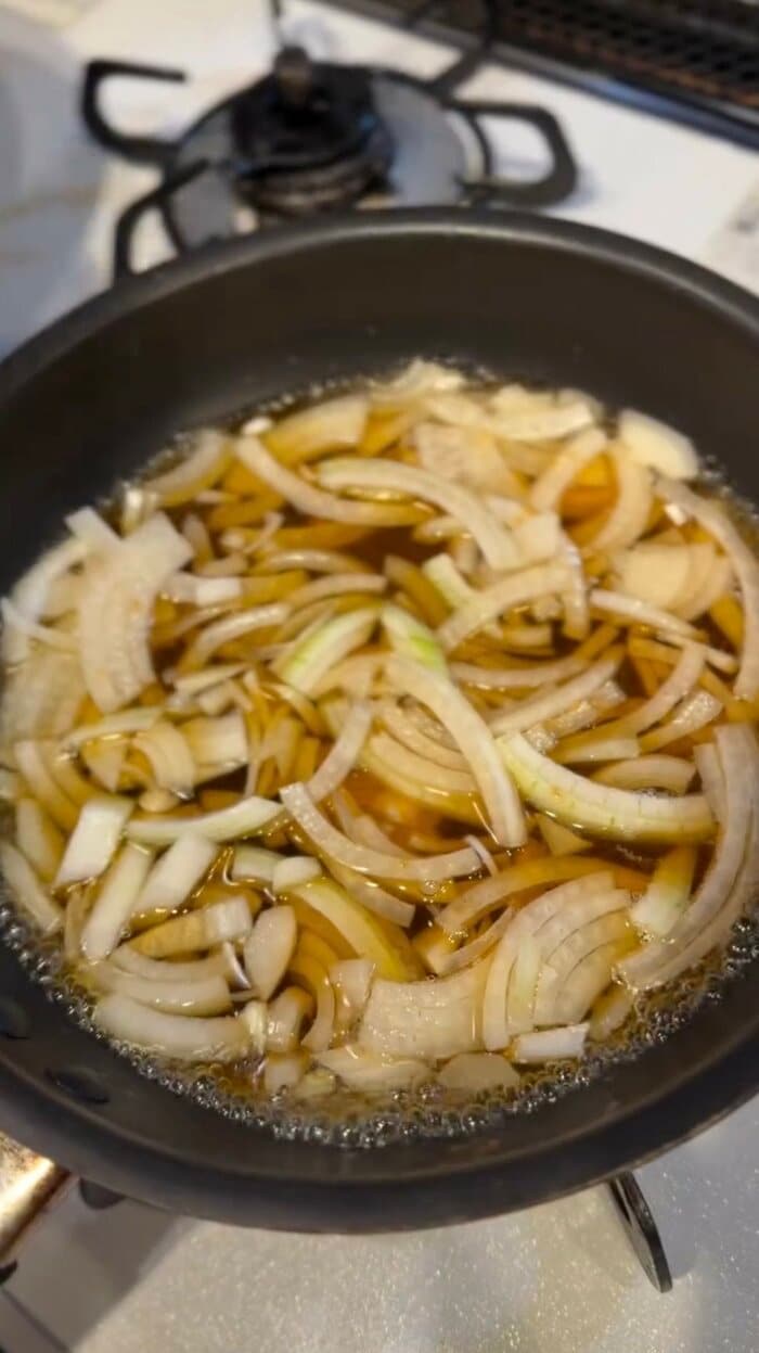 酒、めんつゆ、みりん、黒糖を加えた煮汁でたっぷりの玉ねぎを煮ていき…