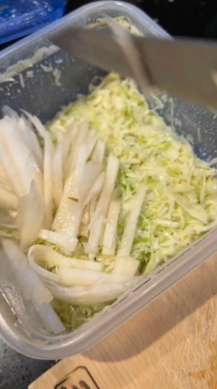 キャベツと梨の千切りに、スパイスソルト、豆乳、レモン汁、マヨネーズを入れて、容器ごとシャカシャカするだけ。