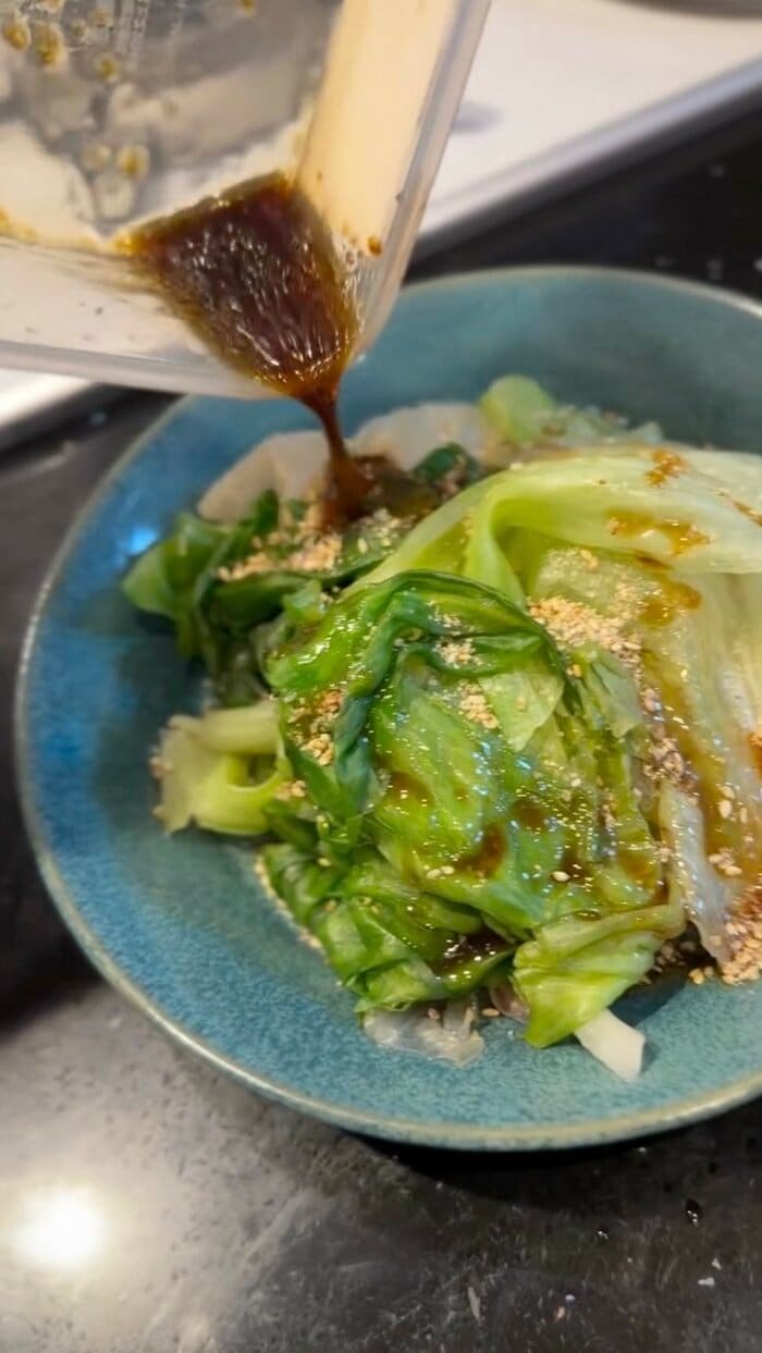茹でたレタスに、ポン酢、黒糖、酒、ごま油を合わせたタレを回しかけるだけの超簡単レシピ!