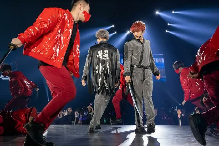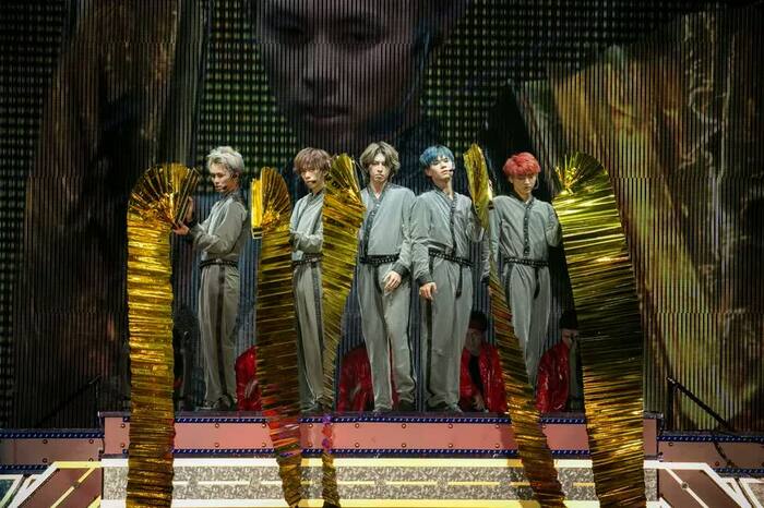 高まる熱気のなか“超特急”の文字が躍り、袴姿のメンバーが舞うオープニング映像が流れると、ステージ上にはそれぞれイメージカラーに和柄の入った煌びやかなセットアップ姿のメンバーが。