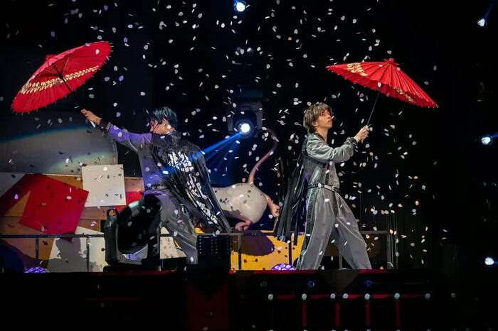 雅やかな二人に対し、センターステージではタクヤとユーキが背中合わせで武闘派な戦いを繰り広げ、二人が「エイヤッ!」と刀を振り下ろせば、バッと血飛沫の赤い紙吹雪が噴き上がる。