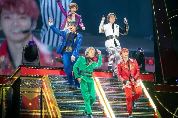お正月アイテムがネオンに輝く舞台の上、おなじみのナンバーがスペシャルな和風アレンジで生まれ変わり、豪快な殺陣のパフォーマンスで新春ムードを盛り立てれば、ゴージャスなムービングステージや客席を駆け巡るトロッコで、メンバーは観客のすぐ間近に。