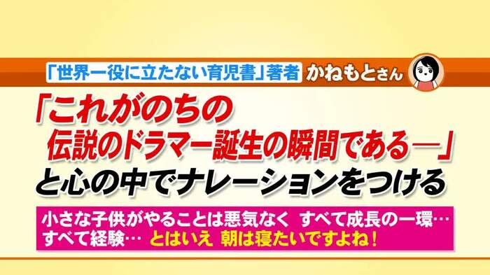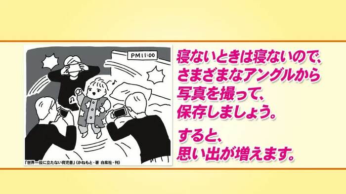 著書の中で、育児書やネットに書いてある「寝かしつけのコツ」を紹介し、「どの方法を取っても子供の気分とその日の運によって成功したりしなかったりする」というオチをつけた、かねもとさんは「寝ないときは寝ないから、写真を撮って思い出を増やす」と、気持ちの切り替え方をアドバイス。