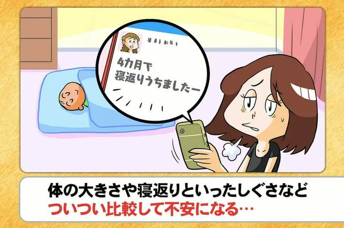 まず登場したのは、「定期検診やSNSで、同じ月齢の子の体の大きさや発育などについて、我が子と比較して不安になってしまう」という“育児あるある”です。