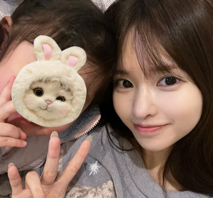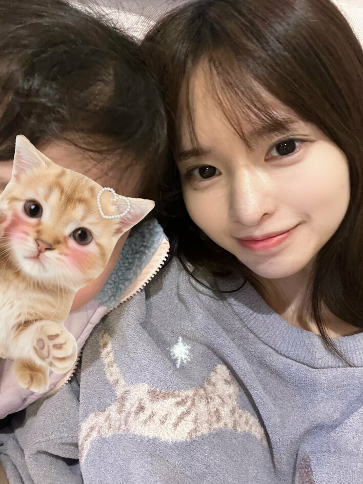 2人はもこもこの温かそうな服を着てリラックスしていて、藤咲さんはにっこりとほほ笑み、次女は顔を猫のスタンプで隠されていて表情は読み取れませんが、和やかな雰囲気が伝わってきます。