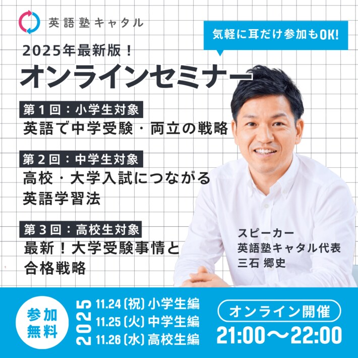 英語塾を運営する株式会社キャタル(本社:東京都渋谷区、代表取締役:三石 郷史、以下キャタル)で最新の入試情報と実践的な学習法をお伝えするオンラインセミナーを3日間にわたって開催いたします。