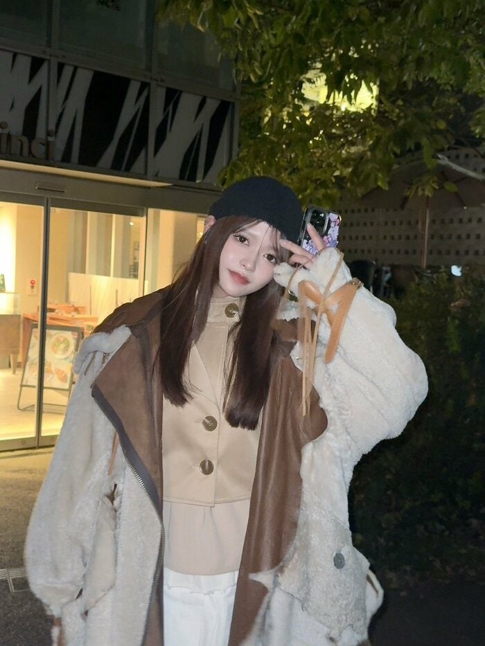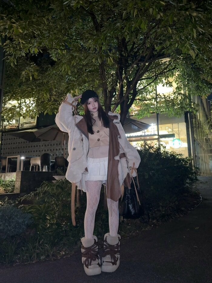 さらに、全身を収めたショットでは、白のミニスカートからスラッと伸びた美脚が際立っています。かなり大きめのブーツが目を引き、センス抜群の着こなしですね。