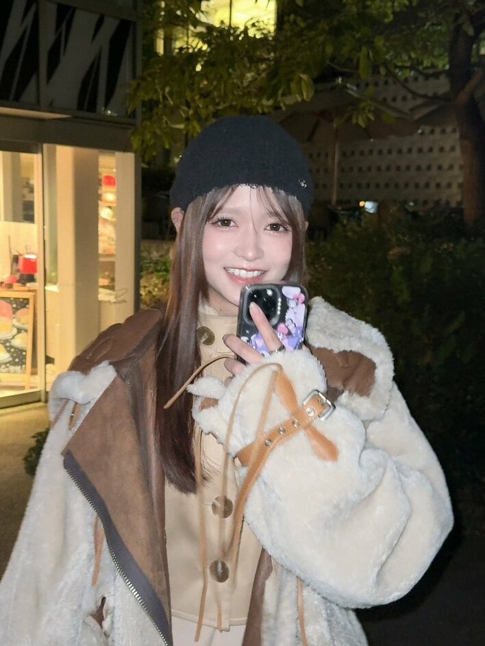 そこには、黒のニット帽をかぶり、モコモコ素材のアウターを羽織る景井さんの姿が!
