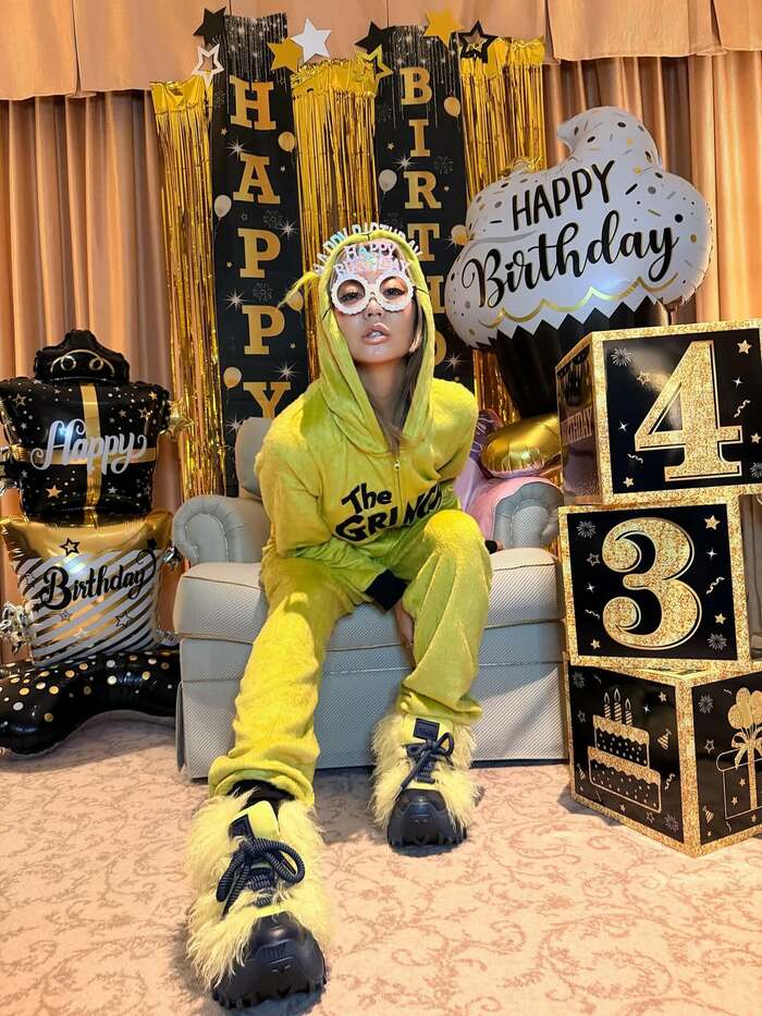 フードをかぶった頭には「HAPPY BIRTHDAY」のカチューシャを身に着け、足元の黒×黄色のシューズには黄色いファーも。誕生日のお祝いにふさわしい、ド派手な明るい装いが素敵です!