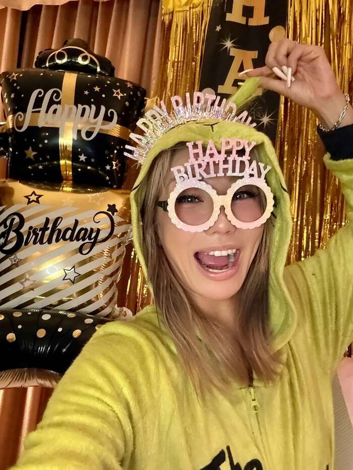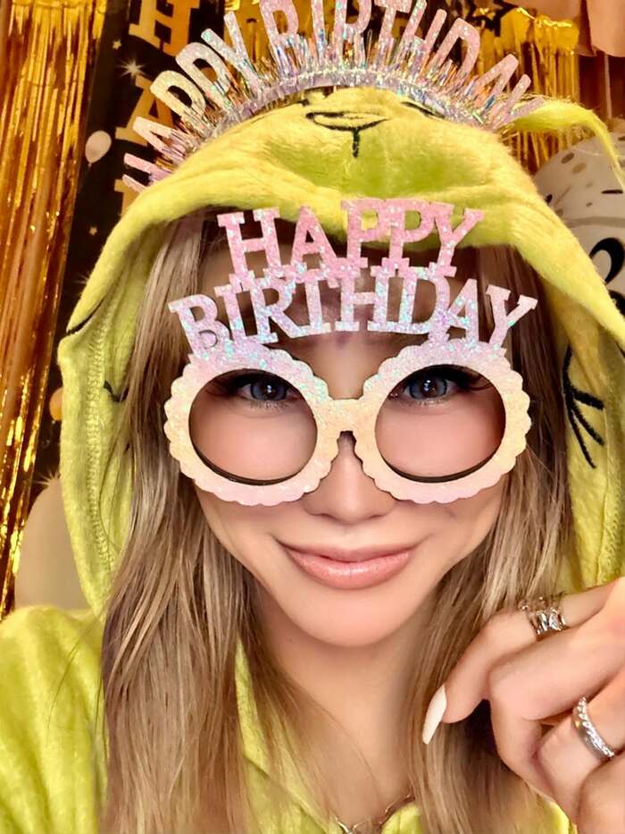 続いて、目元に「HAPPY BIRTHDAY」のメガネをかけた、パーティームードあふれる倖田さん。