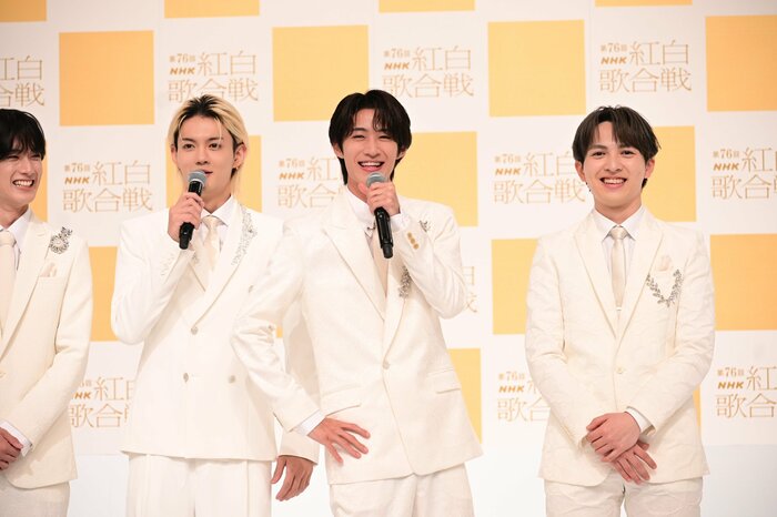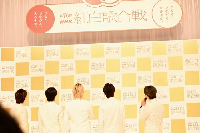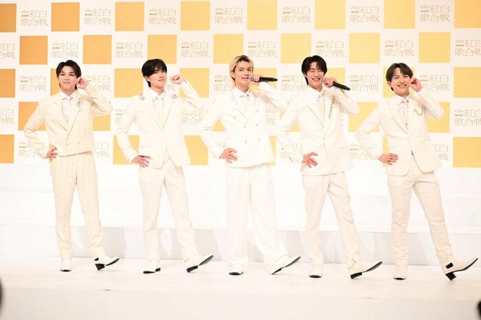 今年はアーティストとして出演することに、「去年、NHKホールの舞台に立たせてもらって、今度は5人で来られますように…という願掛けの意味を込めて、“M!LKポーズ”をさりげなくやったんです。こんなにも早く来られるとは思っていなかったです」とコメントすると、メンバーに対して、「だから、僕は実質、紅白2回目です。みんな僕が先輩だから、ついてきてもらって…」と話し、会場の笑いを誘いました。