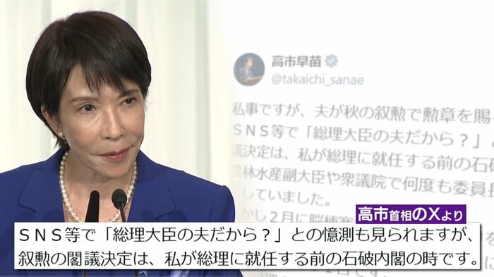 『SNS等で「総理大臣の夫だから?」との憶測も見られますが、叙勲の閣議決定は、私が総理に就任する前の石破内閣の時です。農林水産副大臣や衆議院で何度も委員長を務めた夫は、春の叙勲を楽しみにしていました。しかし2月に脳梗塞で倒れ、リハビリを頑張って体調が落ち着いてきたことから、秋の叙勲の栄誉に浴することになりました。』