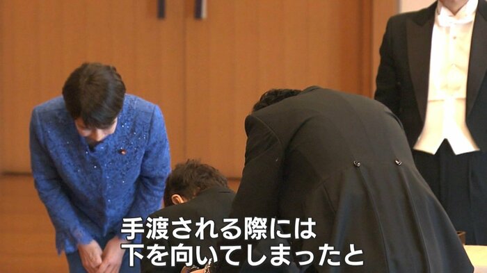 今回の親授式でも、勲章授与後、勲記を手渡す場面で、うれしそうに視線を送っているように見えました。