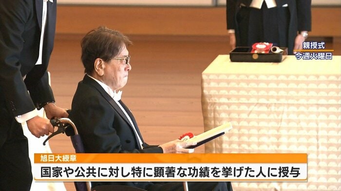 11月11日、「秋の叙勲」の親授式が行われ、今回の最高位である桐花大綬章を受章した、前参議院議長の尾辻秀久氏らが、天皇陛下から勲章を授与されました。