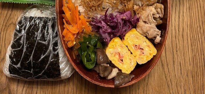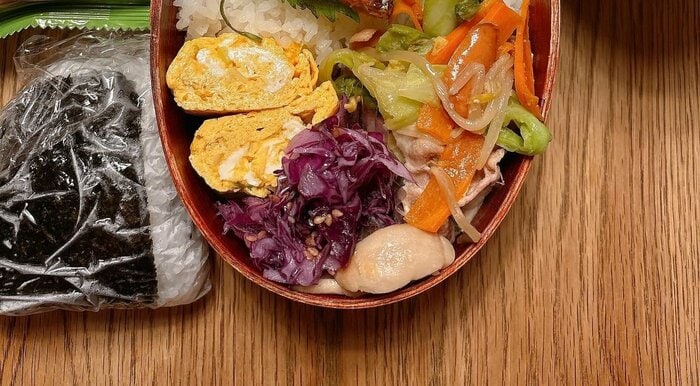 もう半分には、ふわふわの卵焼き、野菜炒め、紫キャベツのマリネとふんだんに盛り付けられています。お弁当箱の横には、のりで巻かれたミニおにぎりも。