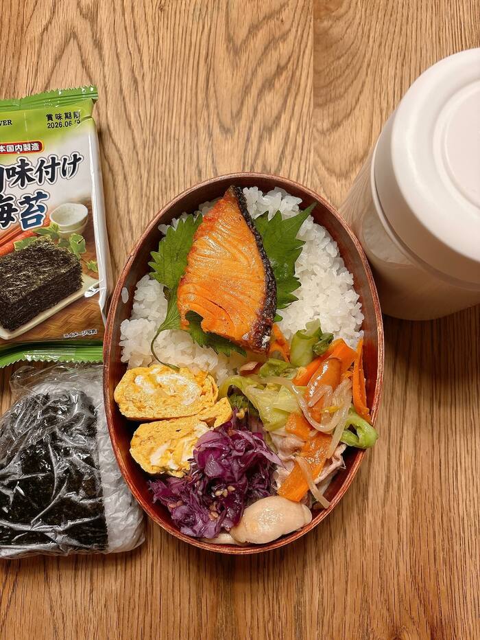 13日にアップした投稿では「本日は、シャケ弁当ですね」とつづり、この日の手作り弁当を公開しています。