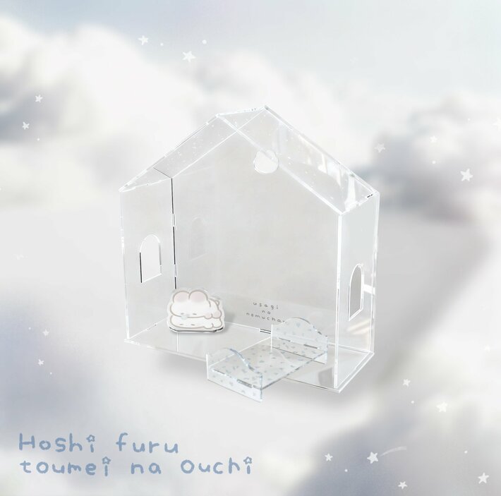 第2弾は、眠ることが大好きな「うさぎのねむちゃん」のためのとうめいなおうちと、REMMEさん描きおろしのアクリルスタンド、とうめいなぷくぷくシールが付いた『うさぎのねむちゃん 星降る夜の、とうめいなおうち アクリルスタンドとぷくぷくシールのセット』です。