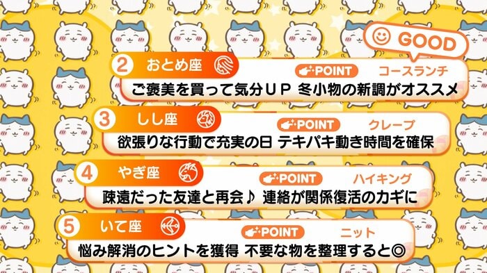 『めざましテレビ』で放送中の「ちいかわ占い」 テレビ放送がない日はお休みで、月~土:朝7時以降に更新予定です。