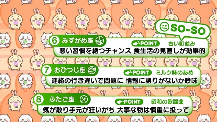 『めざましテレビ』で放送中の「ちいかわ占い」 テレビ放送がない日はお休みで、月~土:朝7時以降に更新予定です。