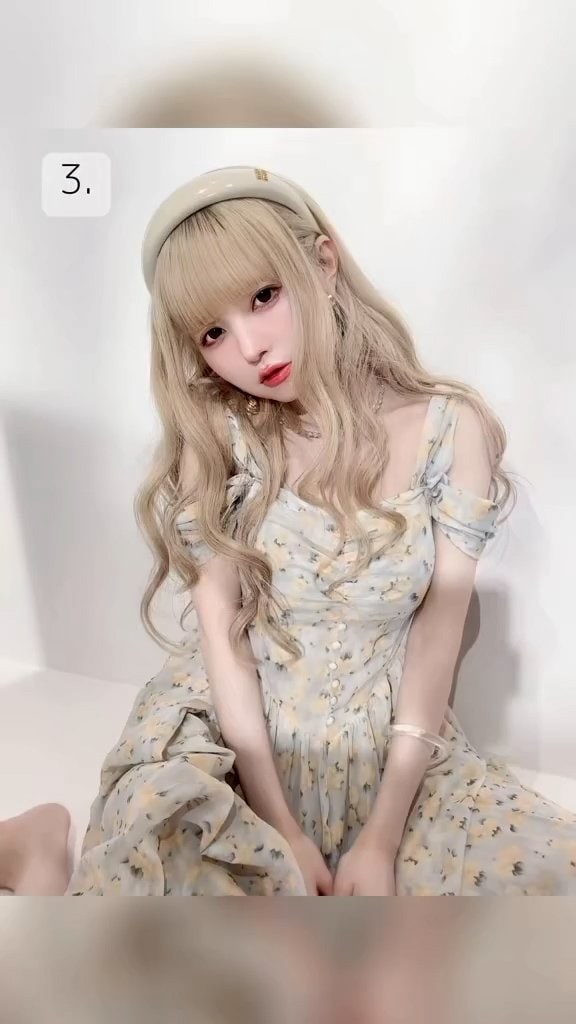 真っ白なロング髪に花柄ワンピースで地べたにペタッと座り込む姿はまるでお人形さんのよう…。